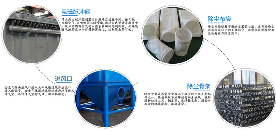 袋式除塵器由灰斗、上箱體、中箱體、下箱體等部分組成,上、中、下箱體為分室結構。工作時,含塵氣體由進風道進入灰斗,粗塵粒直接落入灰斗底部,細塵粒隨氣流轉折向上進入中、下箱體,粉塵積附在濾袋外表面,過濾后的氣體進入上箱體至凈氣集合管-排風道,經排風機排至大氣。 清灰過程是先切斷該室的凈氣出口風道,使該室的布袋處于無氣流通過的狀態(分室停風清灰)。然后開啟脈沖閥用壓縮空氣進行脈沖噴吹清灰,切斷閥關閉時間足以保證在噴吹后從濾袋上剝離的粉塵沉降至灰斗,避免了粉塵在脫離濾袋表面后又隨氣流附集到相鄰濾袋表面的現象,使濾袋清灰徹底,并由可編程序控制儀對排氣閥、脈沖閥及卸灰閥等進行全自動控制。