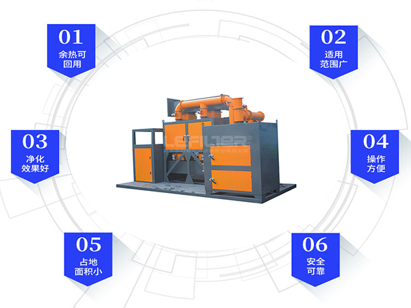 在工業生產過程中,排放的有機尾氣通過引風機進入設備的旋轉閥,通過選轉閥將進口氣體和出口氣體完全分開。氣體首先通過陶瓷材料填充層(底層)預熱后發生熱量的儲備和熱交換,其溫度幾乎達到催化層(中層)進行催化氧化所設定的溫度,這時其中部分污染物氧化分解;廢氣繼續通過加熱區(上層,可采用電加熱方式或天然氣加熱方式)升溫,并維持在設定溫度;其再進入催化層完成催化氧化反應,即反應生成CO2和H2O,并釋放大量的熱量,以達到預期的處理效果。